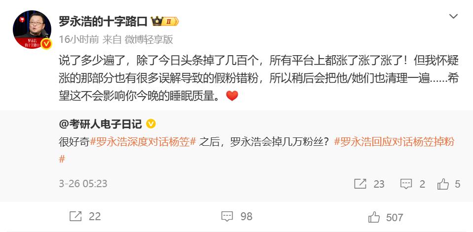 罗永浩则再次强调:“说了多少遍了,除了今日头条掉了几百个,所有平台上都涨了涨了涨了!但我怀疑涨的那部分也有很多误解导致的假粉错粉,所以稍后会把他/她们也清理一遍……希望这不会影响你今晚的睡眠质量。”