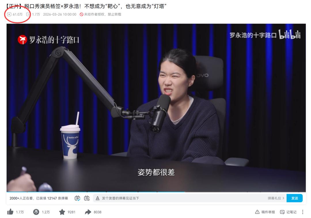 而这一次力挺杨笠,他又一次在流量上赢麻了。数据显示:杨笠这期新播客视频,B站的播放量3天已经超过了60万;微博视频的播放量更是超过了150万。