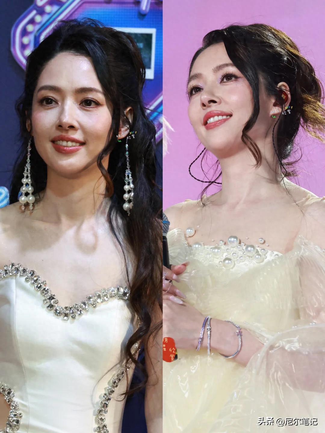 当天她以摇滚女团 ROLLING SISTERS 成员身份出席,先后换了两套造型,第一套米白色缎面长裙本是走温柔大气路线,可镜头里的她却显得格外臃肿,披散的及腰黑长直毫无打理感,发丝凌乱贴在脸上,完全没有了往日的精致。