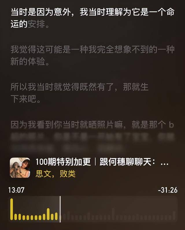 最新一期的播客里,思文与何穗聊天,公布了自己怀孕生子的消息,孩子的到来是意外对思文而言却是命运的安排,是人生的新体验,所以没多想她就决定生下来。