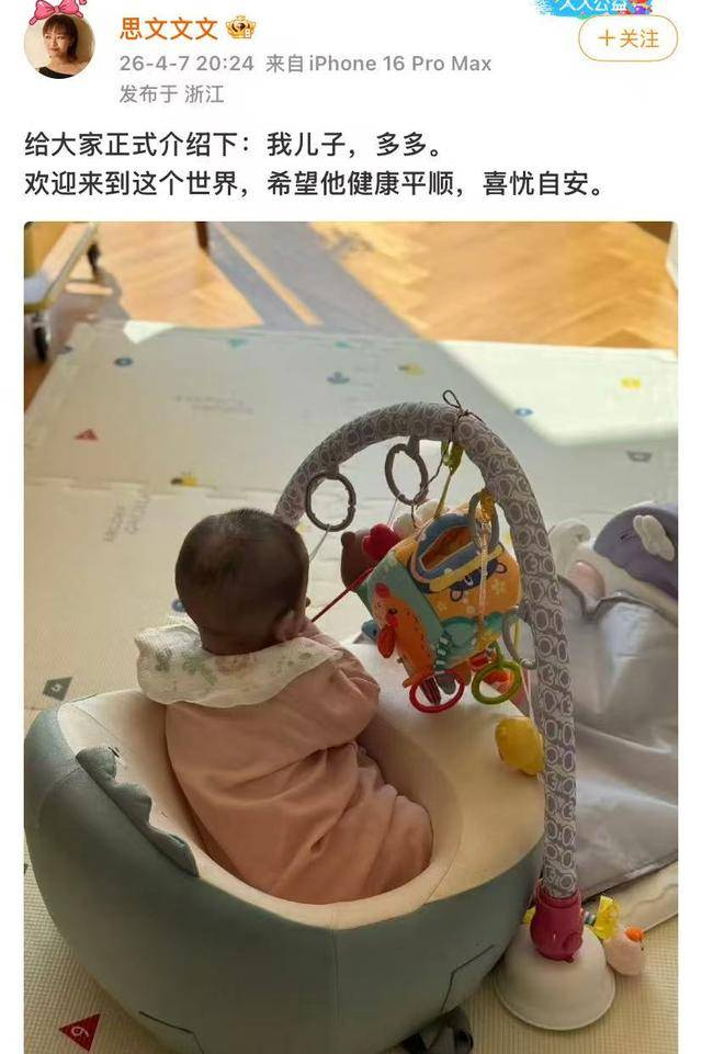 思文晒出儿子照片,取名多多,希望孩子健康平顺、喜忧自安。