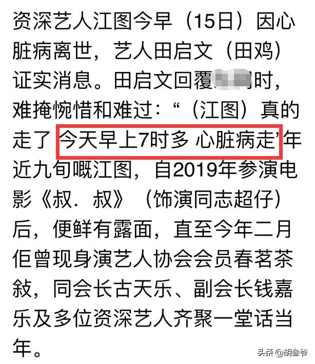 田启文透露,4月15日清晨7点多,他突然接到江图离世的噩耗,心里特别难受,直言“大家又失去一位好好先生”。