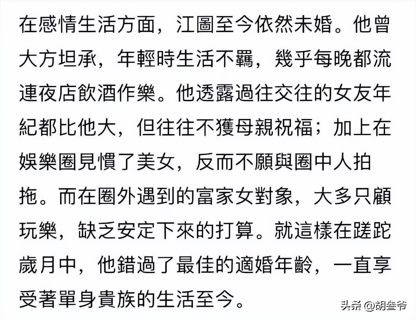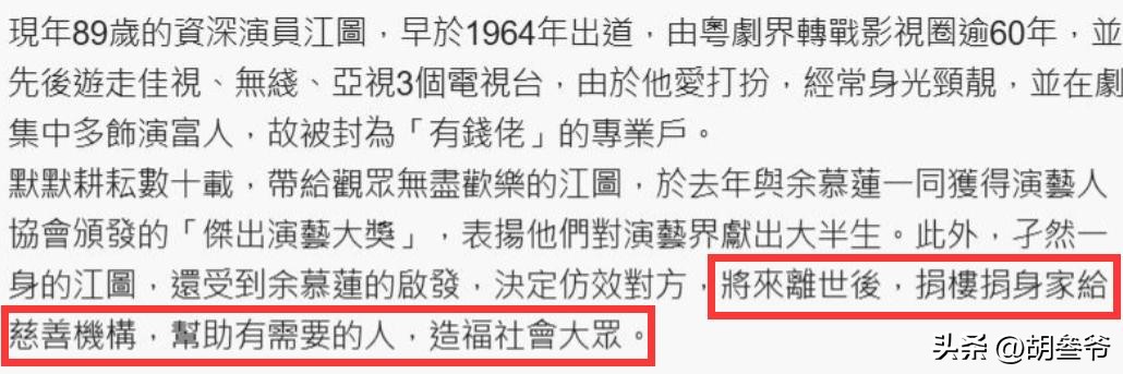 **吃瓜简评:89岁港星江图,裸捐身家却无遗憾**,香港娱乐圈突然失去了一位重要人物——89岁的江图,消息一出,立刻引发网友的热议和同情,江图一生致力于表演艺术,从未结婚无子,却在晚年选择裸捐财产回馈社会,这种无私的精神让人动容,也让人唏嘘。,### **一生演技,绘就经典**,江图,原名江文强,1953年出生于江西泰和,他一生都与表演紧紧相连,60多年来在香港影视圈摸爬滚打,留下了无数经典角色,初入香港电影圈时,他以艺名“江涛”亮相,尝试过正派、反派、小人物等多种角色,后来他改名“江图”,正式开启了长达半个多世纪的荧屏生涯。,1971年,江图加入亚洲电视的前身——丽的电视,成为亚视的忠诚老将之一,在亚视的那些年,江图演出了众多经典角色,尤其是武侠剧《书剑恩仇录》中的“杨逍”和古龙作品《陆小凤》中的“陆小凤”,让他一举成名,他的戏路宽广,从武侠到现代剧,从反派到正派,几乎尝试过所有类型,江图的演技深受观众喜爱,他的反派角色尤其让人印象深刻,眼神阴狠、嘴角算计,寓言无言。,江图曾说过:“一部剧就像一台戏,主角是红花,配角就是绿叶,少了谁都不行。”这份敬业精神让他在圈内享有极高的口碑,即使在晚年,他依然保持着对表演的热爱,2019年在电影《叔・叔》中饰演“超仔”一角,收获了观众的好评,这是他人生最后一部荧幕作品,也是他为观众留下的最后一份礼物。,### **一生单身,无人倾诉**,江图的一生却因感情而遗憾,他一辈子未婚无子,晚年靠干亲陪伴度过,年轻时的他性格浪荡不羁,常在夜店酒吧游荡,交往的女朋友大多比他年长,有位金店老板娘看上他,主动提出结婚,却被母亲坚决反对,或许是和母亲赌气,也或许是没遇到真正想共度一生的人,江图就此单身一辈子。,尽管如此,江图的生活并非一帆风顺,他认了干儿子江晖,两人同住一屋,情同亲生父子,江晖特别贴心,不仅照顾他的饮食起居,还帮他打理穿搭,江图也尽自己的人脉,帮干儿子在演艺圈铺路,寄望着能互相依靠,安稳度过余生。,然而命运的打击总是无情,2017年平安夜,江晖因肝癌病逝,年仅53岁,这一事件对江图打击巨大,他曾悲痛地说:“人生最悲情的事,就是失去最亲爱的人,这种痛苦没人能懂。”尽管江晖临终前托付表哥帮忙照顾,但表哥不能常住,只能偶尔探望,好在命运没有一直亏待他,后来江图认识了干女儿郑家宝,郑家宝做粤剧化妆和推广工作,心地善良,有空就过来陪他喝茶聊天,帮他处理生活琐事,让他晚年不再孤单。,### **最后的选择:裸捐身家**,上个月,江图做出了一个令人难忘的决定——他已经写好遗嘱,要把全部财产裸捐回馈社会,一分都不留给自己,身后事托付给古天乐、田启文、卓慧敏三人处理,他说,这一决定受到了同行余慕莲的影响,看到对方看淡生死、捐身家做慈善,觉得特别有意义,自己也想为社会尽一份力。,很多人好奇,江图一辈子拍戏,到底攒下多少身家?据港媒估算,他名下有一套位于香港佐敦的80平米房产,地段优越,市值就超过千万,再加上他一辈子收藏的珠宝、古董、服饰,总价值相当可观,这些财产,都是他大半辈子打拼的积蓄,可他说捐就捐,没有丝毫犹豫。,89岁的人生,没有遗憾,只有体面与通透,他选择了光鲜地老去,一生精致,对生活的讲究,一直保持到生命最后一刻,他的离开,是香港娱乐圈的损失,但他留下的经典与精神,永远不朽。,### **江图,永远是观众心中的“绿叶”**,江图的一生充满了戏剧性,但最让人难忘的是他的无私与大度,他从未抱怨命运,从未沉溺于遗憾,而是选择用行动回馈社会,用善良结束人生,他的裸捐行为,让人看到了一个真正的大人者的风范。,江图的故事,不仅是娱乐圈的传奇,更是关于一位艺人的坚韧与担当,他的经典角色、敬业精神、无私善举,都将永远被记在观众的心中,无论是“杨逍”、“陆小凤”,还是“超仔”,每一个角色,都承载着江图对表演的热爱与追求。,我们对江图先生深深地致敬!愿您在天堂安好,不再受病痛折磨,愿您继续光鲜亮丽,继续做自己热爱的事,您的一生,虽然无人倾诉,却在观众的心中留下了永恒的印记。
