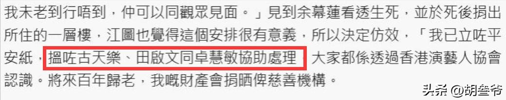 今年3月,江图接受港媒专访时,公开宣布自己已经写好遗嘱,要把全部财产裸捐回馈社会,一分都不留给自己。
