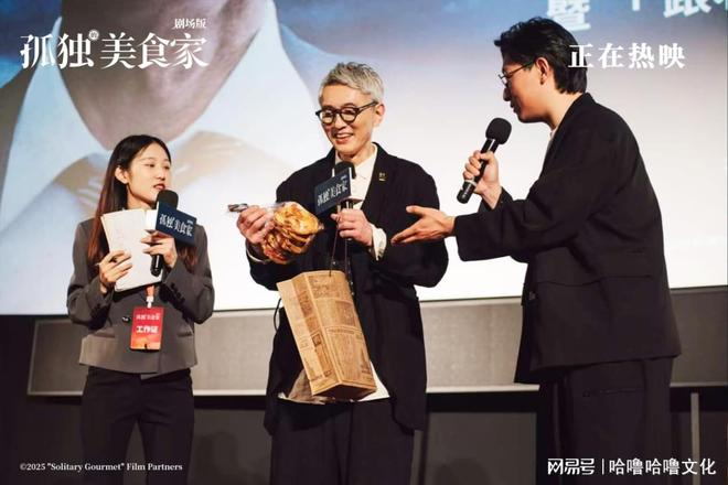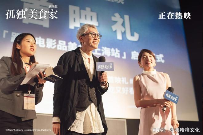 16日举办的首映礼上,上海大光明电影院千人厅座无虚席, 氛围热烈,松重丰开场先向陪伴《孤独的美食家》系列十三年的老朋友们致以谢意,表示《孤独的美食家》开始只是一档深夜节目,因为观众的喜爱和陪伴才走到现在,自己在电影拍摄过程中,也越来越感受到与大家的羁绊,期待和大家一起“吃”下去。提到为何以寻汤作为剧场版的主线,松重丰坦言,因为汤是没有国界,能够给人带来共感共鸣的食物,还爆料自己已经品尝过路演现场观众推荐的番茄鸡蛋汤,非常好喝。面对松重丰的真诚,首映礼现场观众的热情也被点燃,有十三年陪伴的长情老粉激动表白“过去这么多年,都是五郎叔在荧幕陪伴我吃饭,这次换我来大银幕陪伴叔吃饭!”并送上应季的青团作为礼物,松重丰下台穿越人海,奔赴粉丝身边接过礼物。上海路演以来,面对每位提问交流的观众,松重丰都会特意走到身边,送上自己亲手签名的五郎名片作为回礼,尽显用心贴心,首映礼最后的大合影环节,松重丰更是和现场千位观众一起,寄语广大未到场的朋友们“款待自己”暖心值拉满。