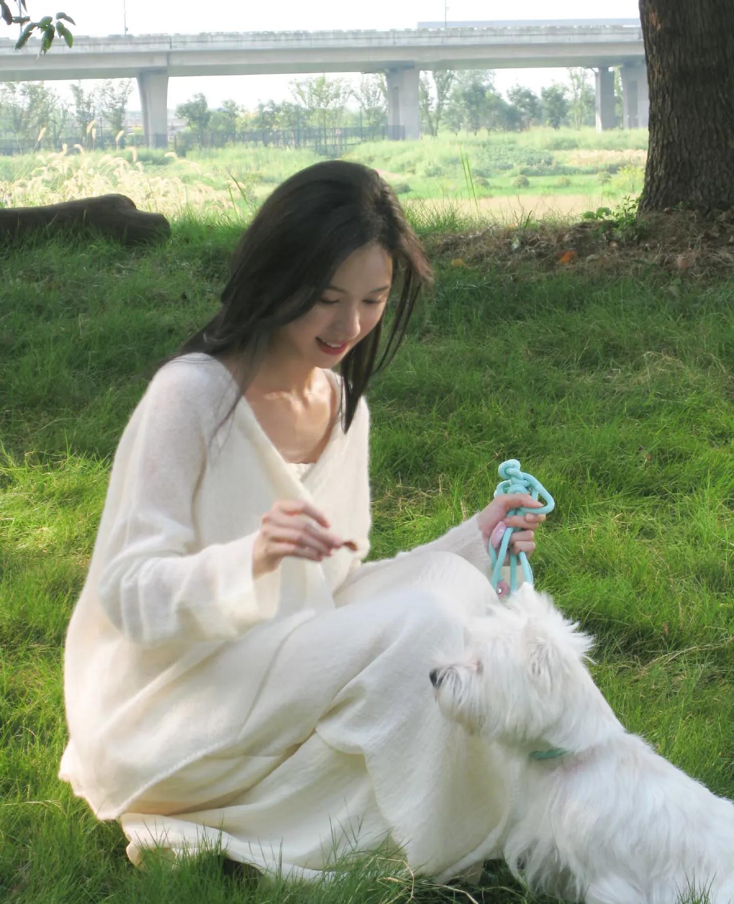 没有繁复装饰,没有堆砌大牌,仅靠简约单品就将清冷温柔的气质拉满。在草坪上与小狗互动、补妆时的抓拍,每一帧都像画报大片。