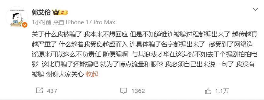 请注意,郭艾伦否认被熟人诈骗,不单单是否认被熟人骗了,也不是否认没有被骗上千万,而是所谓被熟人诈骗这件事就不存在。