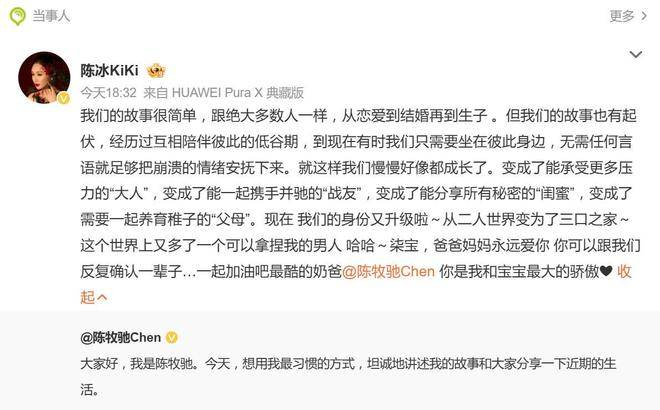 3月28日晚间,演员陈牧驰与歌手陈冰在微博同步发布了一则令人震惊的消息,正式宣布结婚并育有一子。两人不仅晒出了自己孕肚的合影,还放出了一张三口之家温馨的合照,照片中一家三口的拳头紧紧相碰,传递着浓浓的亲情。这一消息立刻引发了社交网络的广泛关注,话题#陈牧驰陈冰结婚生子#迅速登上了热搜榜首,网络上的反响沸腾一片。