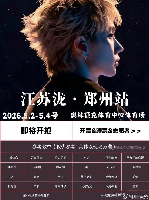 汪苏泷2026年全新巡演「明日世界」首站定档郑州,5月1日-3日及8日-10日连开6场,预售将于4月2日启动;同时,他刚完成「罗曼前传」世界巡演新加坡收官站,以高口碑座无虚席引爆海外市场。