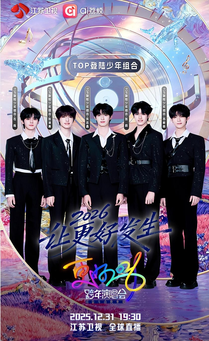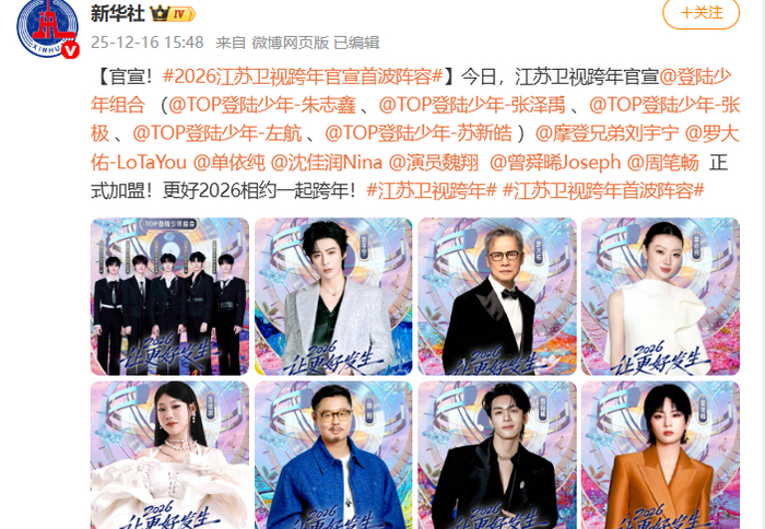 【官宣!#2026江苏卫视跨年官宣首波阵容#】今日,江苏卫视跨年官宣@登陆少年组合 (@TOP登陆少年-朱志鑫 、@TOP登陆少年-张泽禹 、@TOP登陆少年-张极 、@TOP登陆少年-左航 、@TOP登陆少年-苏新皓 )@摩登兄弟刘宇宁 @罗大佑-LoTaYou @单依纯 @沈佳润Nina @演员魏翔 @曾舜晞Joseph @周笔畅 正式加盟!更好2026相约一起跨年!#江苏卫视跨年# #江苏卫视跨年首波阵容#