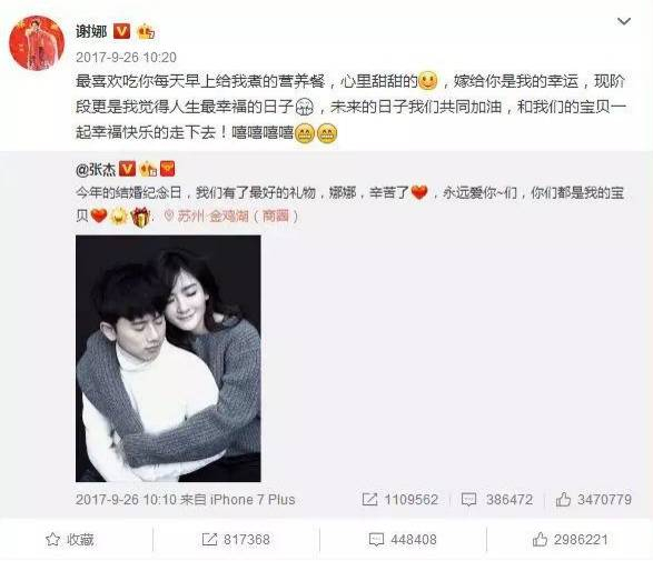 2017年9月26日上午10点10分,张杰在微博上证实宣布了谢娜怀孕的喜讯。