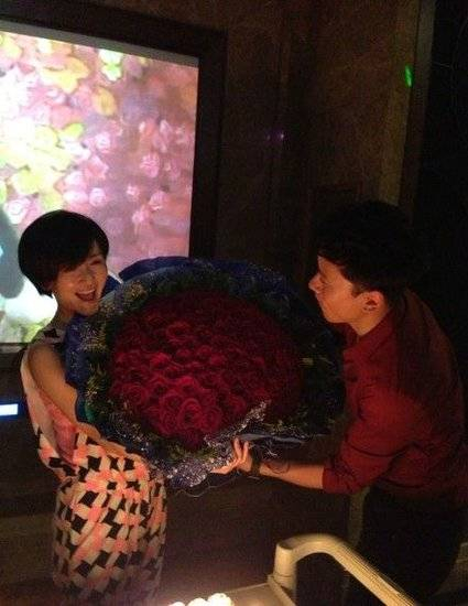 2013年5月16日,谢娜生气,何炅发布了一张疑似在生日派对上的照片,张杰深情看着谢娜并送上大束红玫瑰。