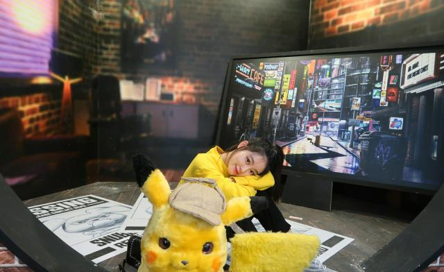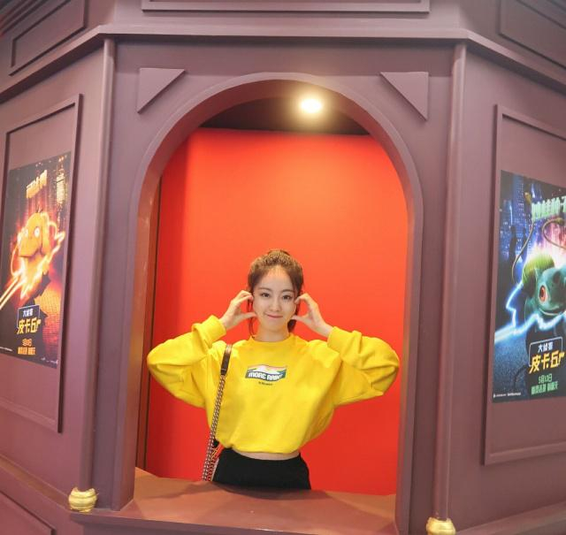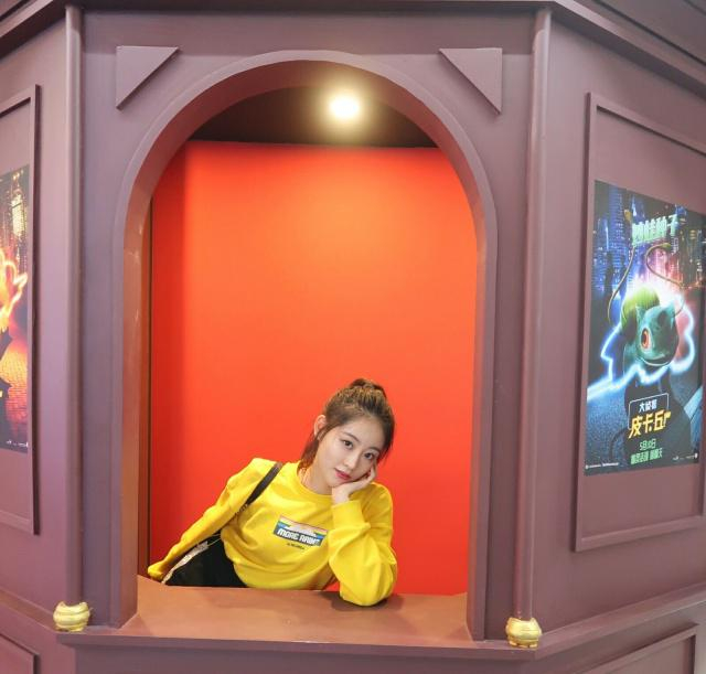看祝绪丹和“皮卡丘”的合影,后面又各种类似商场或者电影院的背景,还有电影《大侦探皮卡丘》的海报,让人猜测她是不是去看电影了?
