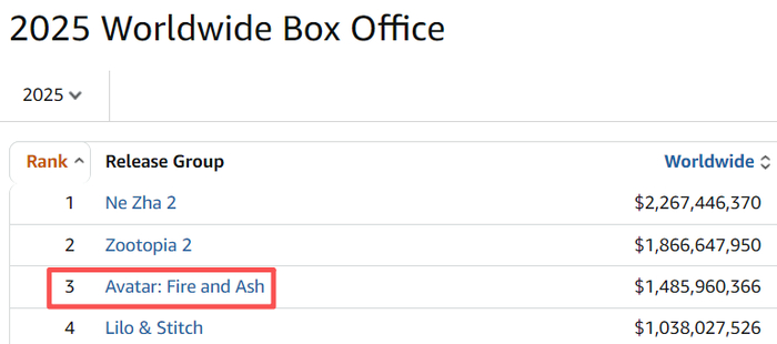 《阿凡达3》以很大的差距败给了《哪吒2》,只拿下了全球年度票房榜第三名,已经让人感到很意外了,而更让人意外的是,它的前作《阿凡达2》在未来不久也很可能会被《哪吒2》赶超。