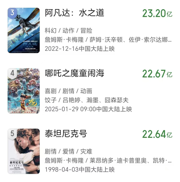 前不久,通过新一轮的票房补录,《哪吒2》的全球票房成绩已经超过了22.67亿美元。这使其成功打败了《泰坦尼克号》,位居全球影史票房榜第四名。