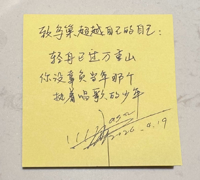核心寄语:在2026年4月21日《爱乐小浪》直播中,张杰应节目组邀请写下便签,寄语完成16场鸟巢演唱会后的自己:“致鸟巢超越自己的自己:轻舟已过万重山,你没辜负当年那个执着唱歌的少年。”这句话被视为对音乐初心与奋斗历程的深情回应。