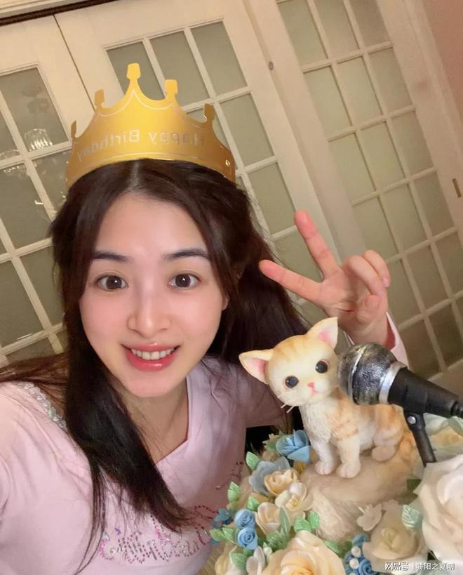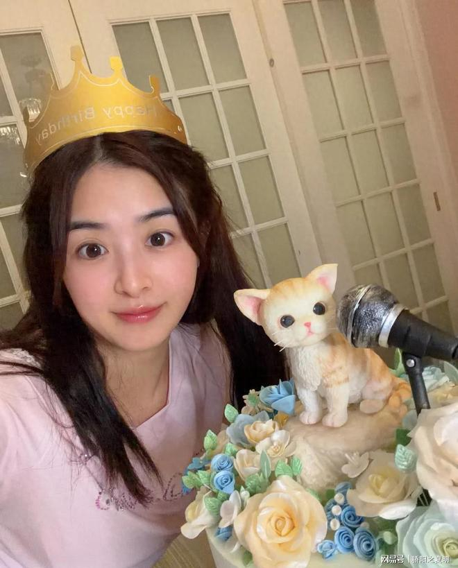 37岁的她,戴着专属的生日帽,在猫咪生日蛋糕前开心地比耶记录,状态看起来依旧是少女心不减。