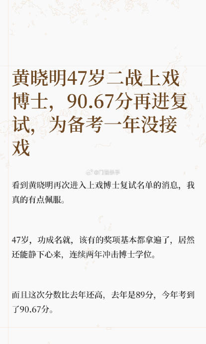 48岁的黄晓明以90.67分的初试成绩再度入围上海戏剧学院博士复试,较去年89分的成绩提升1.67分,以并列第一的姿态向"家族首位博士"的目标发起二次冲击。