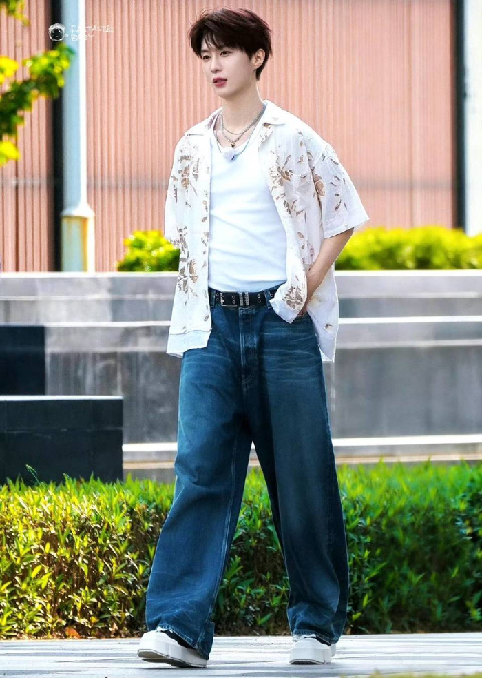 范丞丞这回的造型有点80年代街溜子的范儿,背心配花衬衫,再加阔腿牛仔裤,休闲又洋气。