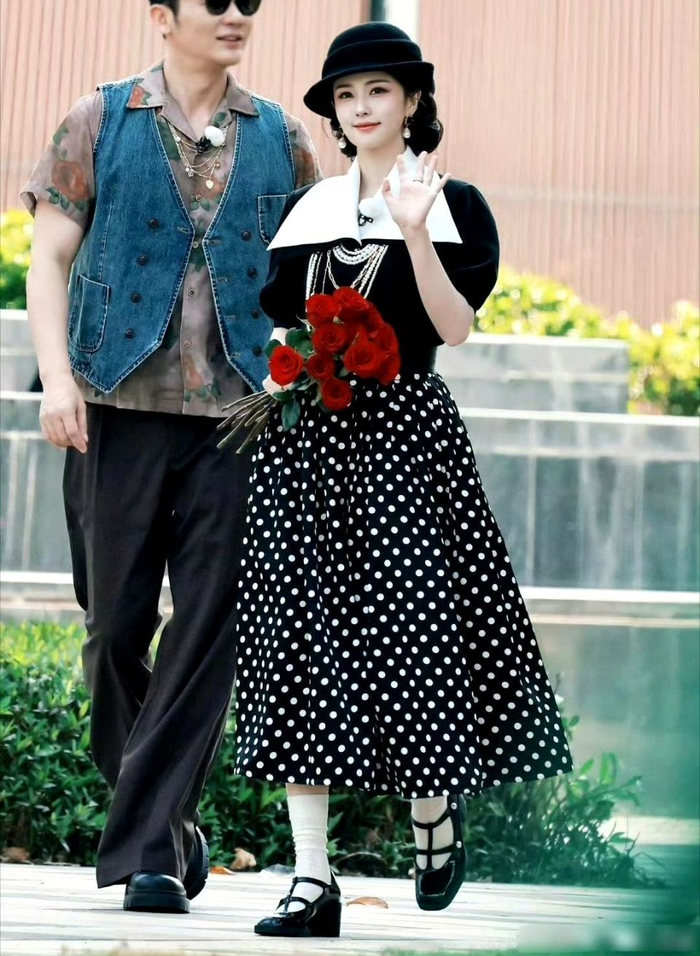 首期节目中白鹿身穿复古风套装,黑白拼色简约大气,很有归国千金的大小姐风范。