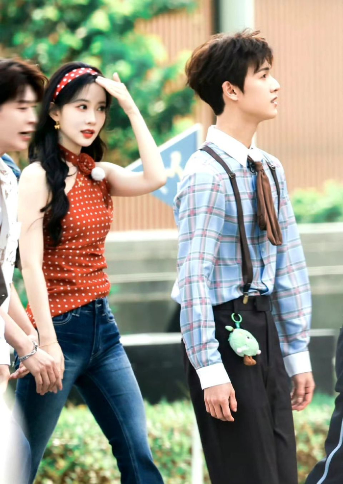 红色波点上衣搭配蓝色牛仔裤的孟子义,明媚温婉又有韵味,而李昀锐则是穿着格子衬衫搭配棕色吊带裤,清新阳光又自然。