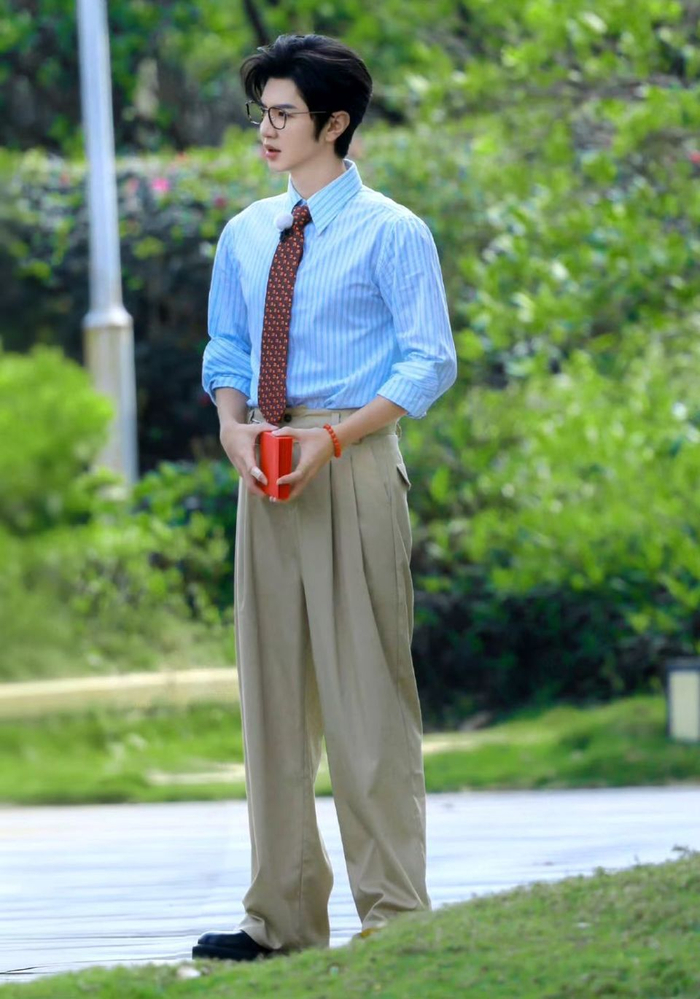 陈哲远蓝色条纹衬衣配卡其色休闲裤,戴着眼镜,气质干净又清爽,符合我对完美学长的所有想象。