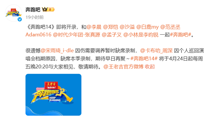 除此之外,备受期待的《奔跑吧14》也官宣了定档时间,将于4月24日开播。