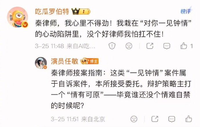 严肃职场剧结合趣味互动,形成反差萌点。如“情难自禁”的辩护理由被网友调侃为“最温柔的法律援助”,相关话题#任敏回复罗伯特秒变秦律#单日阅读量激增。