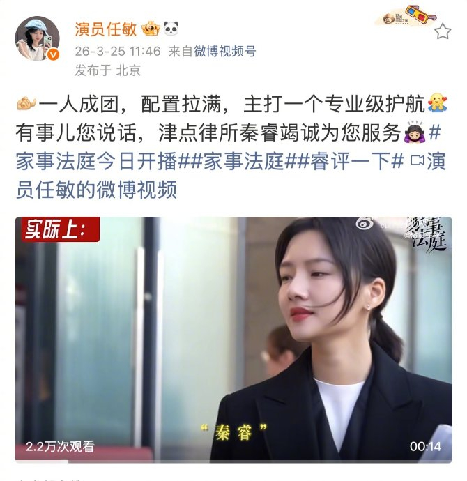 任敏在今日《家事法庭》宣发微博中,以剧中律师“秦睿”身份幽默回应网友罗伯特的“一见钟情诉讼”,将剧内专业人设搬到剧外互动,引发全网热议。