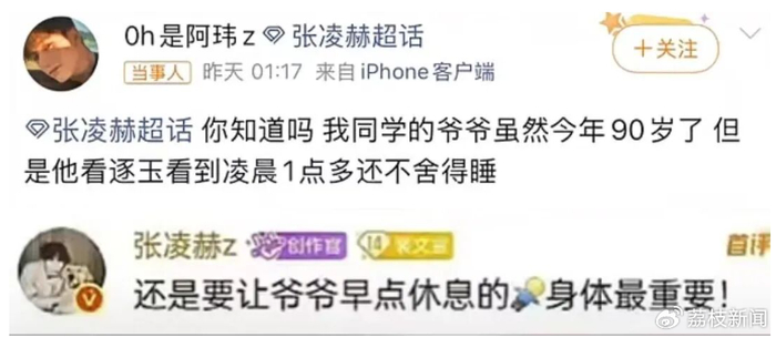 不仅是业界的专家,之前有新闻报道一位90岁老人因为追《逐玉》,看到凌晨一点还舍不得睡觉,张凌赫暖心回复:“还是要让爷爷早点休息,身体最重要”。