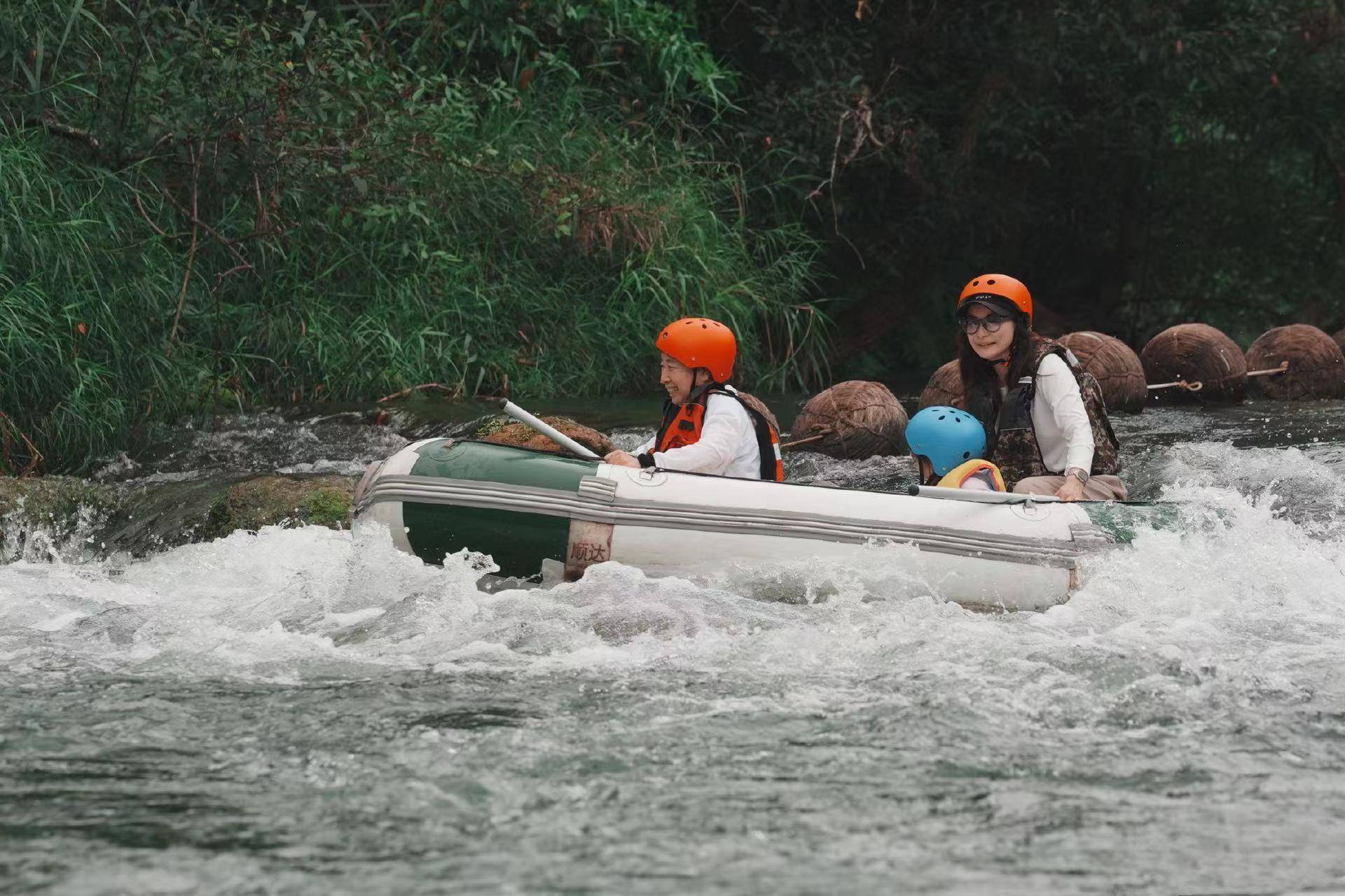 郭晶晶带孩子们漂流,坐的皮划艇。