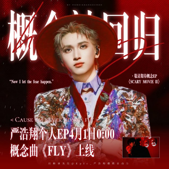 专辑开篇曲《FLY》于2026年4月1日0点正式上线,作为整张EP的“大型引言”,奠定暗黑悬疑基调,并延续严浩翔“愚人节发歌”的仪式感传统(两年前同一天发布首张EP《Scary Movie I》先行曲《The Beast》)。