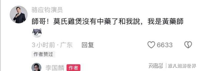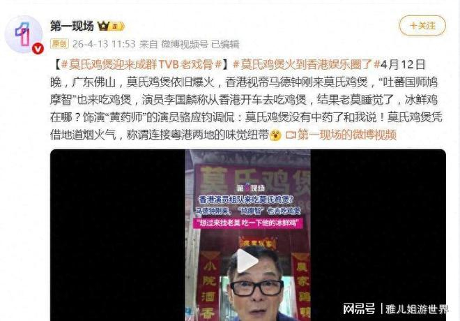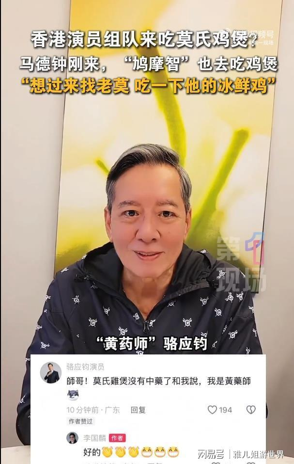 这场“明星追美食却追不到”的戏码,瞬间点燃了评论区。更绝的是,在83版《射雕英雄传》中饰演“黄药师”的演员骆应钧也前来“跨界助攻”,他在李国麟的视频下留言调侃:“莫氏鸡煲没有中药了和我说,我是黄药师!”一句台词梗,瞬间把“东邪”的江湖气和市井鸡煲联系了起来,喜剧效果拉满。