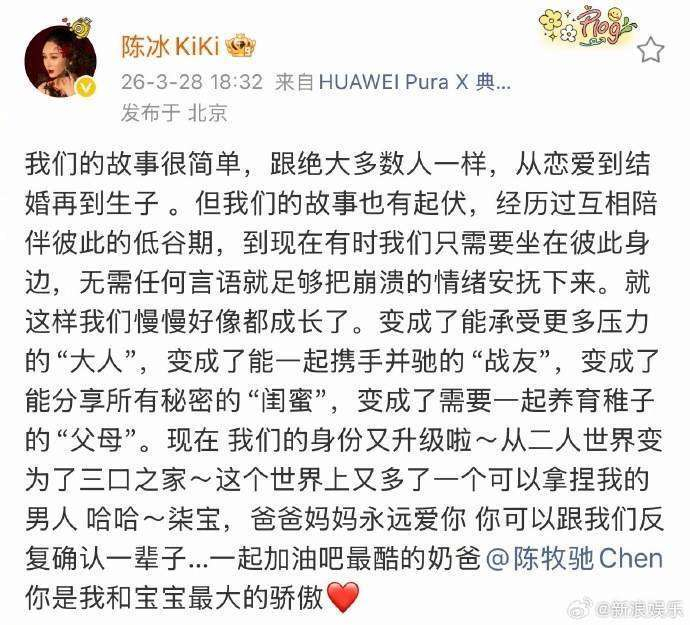 3月28日,陈牧驰在自己的社交平台上发布了一篇近千字的长文,正式宣布了他与陈冰的婚讯,同时分享了孩子柒宝的降生。在文字中,他没有回避过去一年的舆论风波,反而用盾牌战友这样的词来形容妻子对他的陪伴。字里行间透露出经历风雨后的踏实与坚定。最令人动容的,是结尾那句:从未放弃对表演的热爱。在经历了事业停滞和舆论争议的至暗时刻后,这位29岁的年轻演员,用最直接的方式向所有人宣告:他准备回来了。