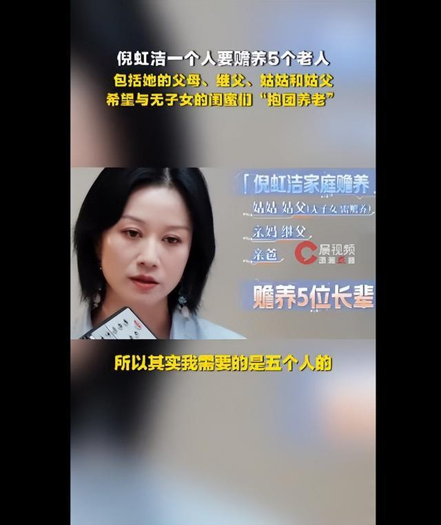 4月7日,演员倪虹洁在综艺节目中坦言,需独自承担五位长辈的赡养责任,包括她的父母、继父、姑姑和姑父,其姑姑和姑父没有子女,母亲再婚后又有新的婚姻关系,她表示计划与相伴十余年的经纪团队、无子女的闺蜜们“抱团养老”,形成情感与生活上的互助支持。