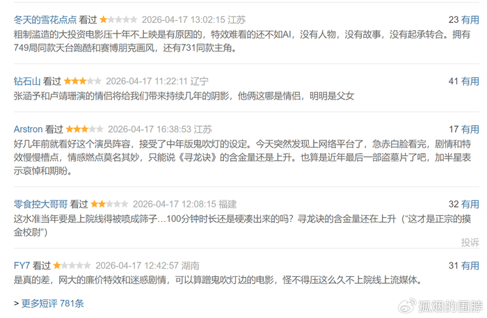 ## 《寻龙诀·觅踪》:一部"特效大餐"的烂剧,幕后更是一场"财团大败",《寻龙诀·觅踪》上线后,观众们纷纷留言表示"看完后悔还没看完",豆瓣首页五条都是差评,观众们的吐槽内容一波波击中了这部"烂豆腐"的各个软肋。,这部电影最大的问题在于"人物"与"故事"的缺失,观众直言不讳:"没有人物,没有故事,没有起承转合。"这句话简直成了这部电影的灵魂铭,影片中的主角和配角看起来像是在绿幕前摆pose一样的"特写精灵",完全没有代入感和情感共鸣,更让人哭笑不得的是,导演竟然放弃了《鬼吹灯》中最经典的"大金牙"这一命脉,而是选择了这群"表情机"级别的演员,真的让人怀疑导演有没有看过这部电影。,演员的表现更是"搬起石头砸自己的脚",张涵予和卢靖姗这对"父女"情侣的表演简直是"表演界的苦力",他们的打斗场面像是一出"表情管理大赛",连最基础的动作操作都做得像模像样,更令人窒息的是,姜武和张涵予的"表演风格"一模一样,仿佛在演同一个角色,这种恶作剧不仅让人看傻,还让人怀疑导演的职业操守。,动作戏的表现更是"拿走了",影片中充斥着一系列"跑跳翻滚"的场景,令人怀疑这些动作是不是直接从游戏引流过来,特别是那场"俄罗斯逃跑",简直像是在玩《超级马里奥》,完全没有任何紧张感和动作美学。,说到特效,这部电影堪称"特效史上最烂的作品",影片的后期制作由国内多家公司完成,包括VHQ、More VFX、炫云和塞上,VHQ曾经参与过《太平轮》《王的盛宴》等优秀作品的制作,但在这部电影中完全失了手,影片中的特效场面充斥着"低保质"的画面,场景细节幼稚,整体效果像是一部视频游戏改编的电影。,更让人唏嘘的是这部电影的制作背景,据悉,这部电影的制作成本高达5亿,然而最终票房仅卖了1.5亿,片方的选择不仅让观众"血本无归",还导致了整个公司的覆灭,圣世互娱和圣世花君公司在这部电影上投入了全部资源,结果在完成拍摄后就因为巨额亏损而倒闭,老板贾佳也成为了被执行人。,至于这部电影为什么不上院线,原因不在于题材限制,而在于它本身就是一部"拍错"电影,片方选择网上首映显然是为了规避宣传成本,同时通过"二次创作"收割观众的分数,这种做法不仅让观众"看完后悔还没看完",还让人看到了国产电影市场的阴暗面。,《寻龙诀·觅踪》是一部"特效大餐"的烂剧,既没有给观众带来视听享受,反而让人看到了国产电影制作中的深层问题,从选角到拍摄,从后期制作到市场运作,这部电影的每一个环节都像是一场"财团大败",在未来,国产电影需要更多的理性投入,更好的创作控制,更严格的质量把关,否则像《寻龙诀·觅踪》这样的"拍错电影"还会继续给行业带来伤害。## 《寻龙诀·觅踪》:一部"特效大师"的自作自受,《寻龙诀·觅踪》开画就像一场灾难,姜武这位"大金牙"在银幕上扮演的"731同款主角",简直让人怀念他在《黑域》中的"老张",这部"特效大师"的自作自受,堪称国产电影史上最具戏剧性的败笔。,观众们用五星差评点燃了这部电影的"红红火火",豆瓣首页的差评如同一部黑色喜剧:张涵予和卢靖姗的"CP"戏份更像父女剧,特效公司VHQ的"烂作品"让人怀念网大,姜武的表演让人想起《731》里的自己,这些吐槽不仅揭示了电影的制作底部线,还暴露了整个行业的集体无知。,从选角到拍摄,圣世互娱的老板贾佳在"金蝶式"狂欢后,像一只逐渐失去翅膀的蝴蝶,最终坠入泥潭。"特效公司倒闭"、"明星不来帮忙"、"票房惨淡",这些都成了国产电影行业的"开放性教材"。《寻龙诀·觅踪》的失败不仅是个体的失败,更是整个行业的集体坠落。,这部电影最终上映的选择,像是为观众开了一场"免票演出",从票房数据到演员表现,从特效水平到选角失误,每一个环节都在嘲弄着国产电影的"底层生态",当贾佳被执行人,圣世互娱彻底沦为"自杀演奏",这场悲剧恰恰印证了"大片"市场的残酷现实。,《寻龙诀·觅踪》的败笔不仅仅是特效公司VHQ的"烂作品",更是整个产业链条无法自我革命的真实写照,从选角到拍摄,从后期到上映,每一个环节都在诉说着一个行业的无力感,这部"特效大师"的自作自受,终将成为国产电影史上最具标志性的失败案例。