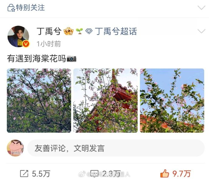 - 浪漫投射:粉丝从“偶遇海棠必分享”的行为中解读出专属暗号——海棠是粉丝的代称,赏花被视作“他在以花喻人”。话题#丁禹兮拍海棠花#下,粉丝感慨“他看花时一定想起了我们”。