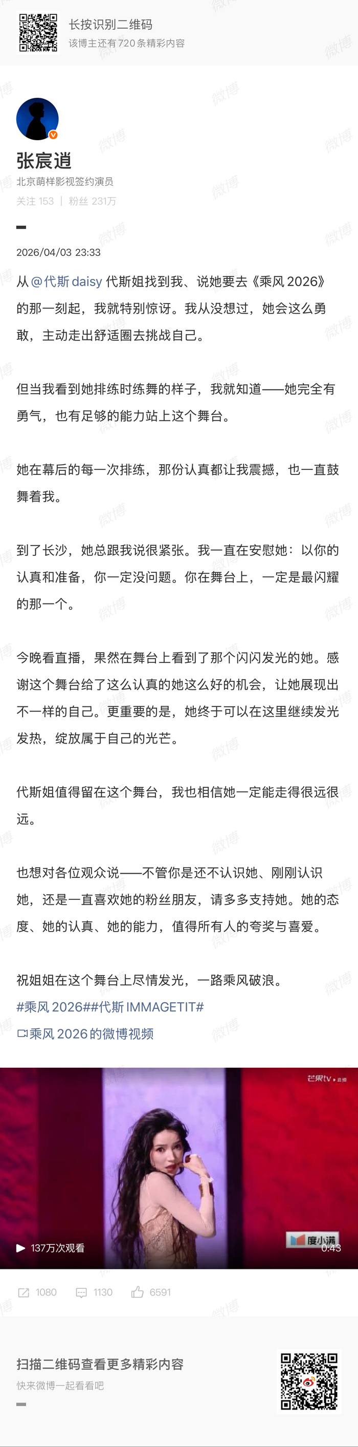 张宸逍长文真的走心满是认可与鼓励,见证代斯为舞台的全力以赴。