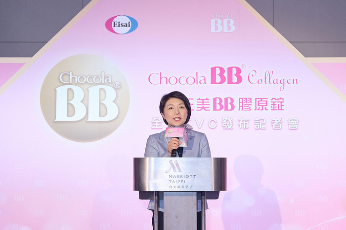 日本衛采製藥總公司 hhc 事業部總裁內藤 Eriko 小姐與衛采製藥股份有限公司董事長胡耀中先生,今天也親自出席記者會,與曾沛慈共同揭曉全新廣告內容,期望透過曾沛慈由內而外的美麗自信及在演藝事業的自我實踐,為 Chocola BB 膠原錠的在台銷售推上另一個高峰。