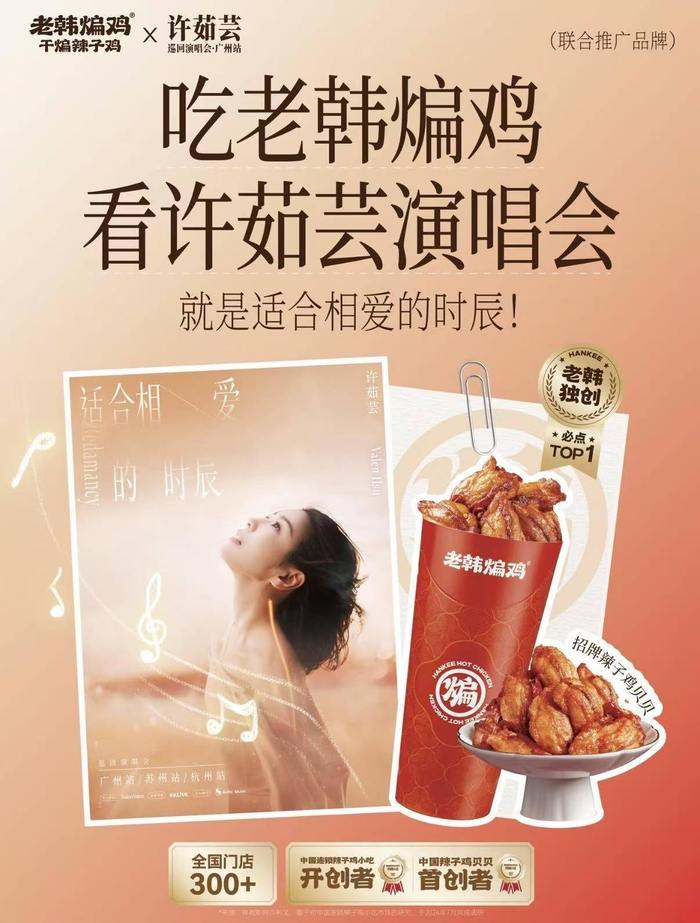 同年10月,老韩煸鸡与国民歌者许茹芸合作,邀请大家共赴「适合相爱的时辰」演唱会,许茹芸在品尝了辣子鸡贝贝后更是对老韩煸鸡赞不绝口,发展近30年的中式炸鸡品牌与出道30年的国民歌者在此刻奏出深情的回响。