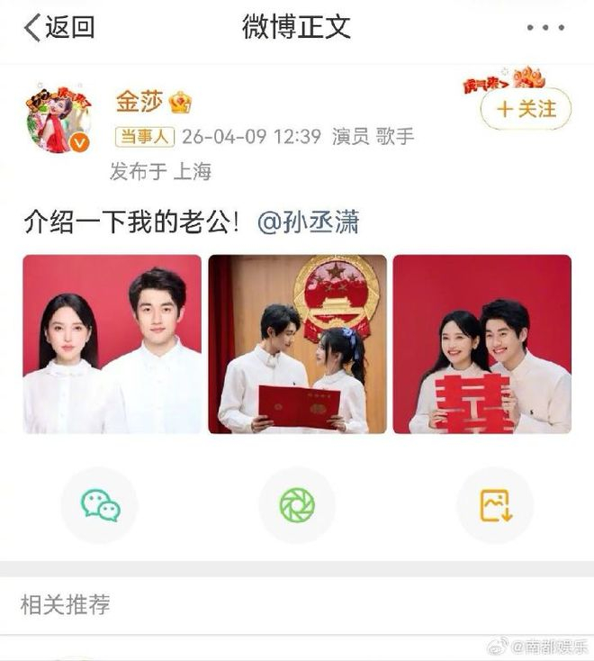 节目播出当日,金莎和孙丞潇也在微博发文分享了领证结婚的喜讯。