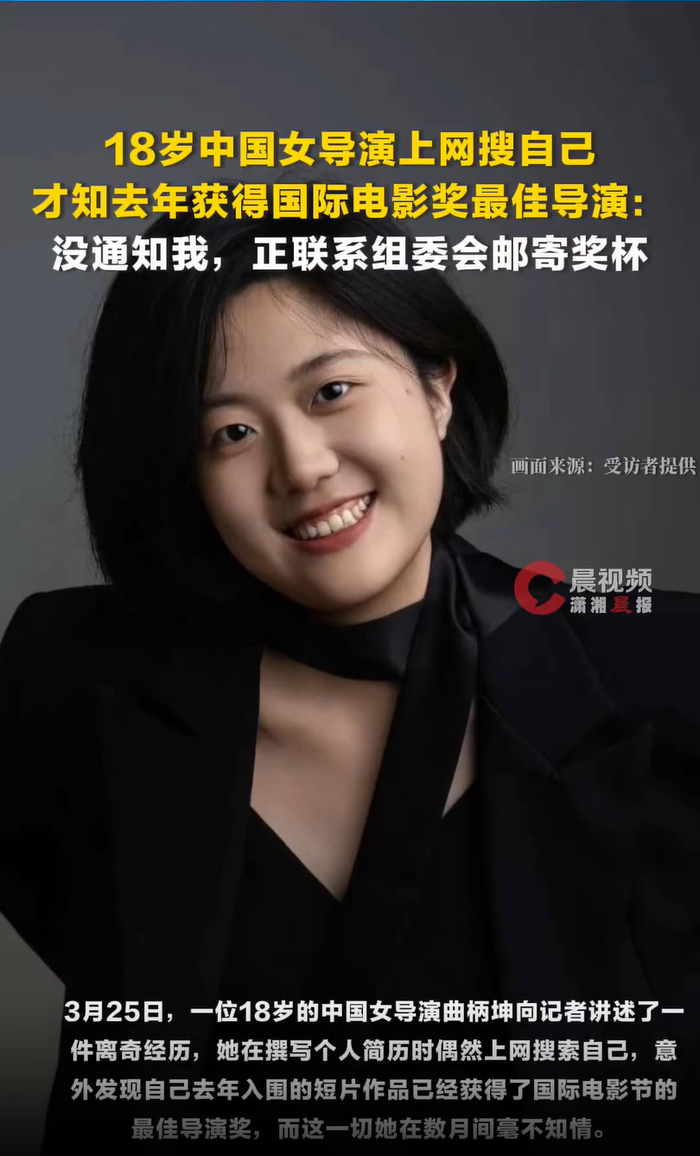 3月25日,一位18岁的中国女导演曲柄坤向潇湘晨报记者讲述了一件离奇经历,她在撰写个人简历时偶然上网搜索自己,意外发现自己去年入围的短片作品已经获得了国际电影节的最佳导演奖,而这一切她在数月间毫不知情。