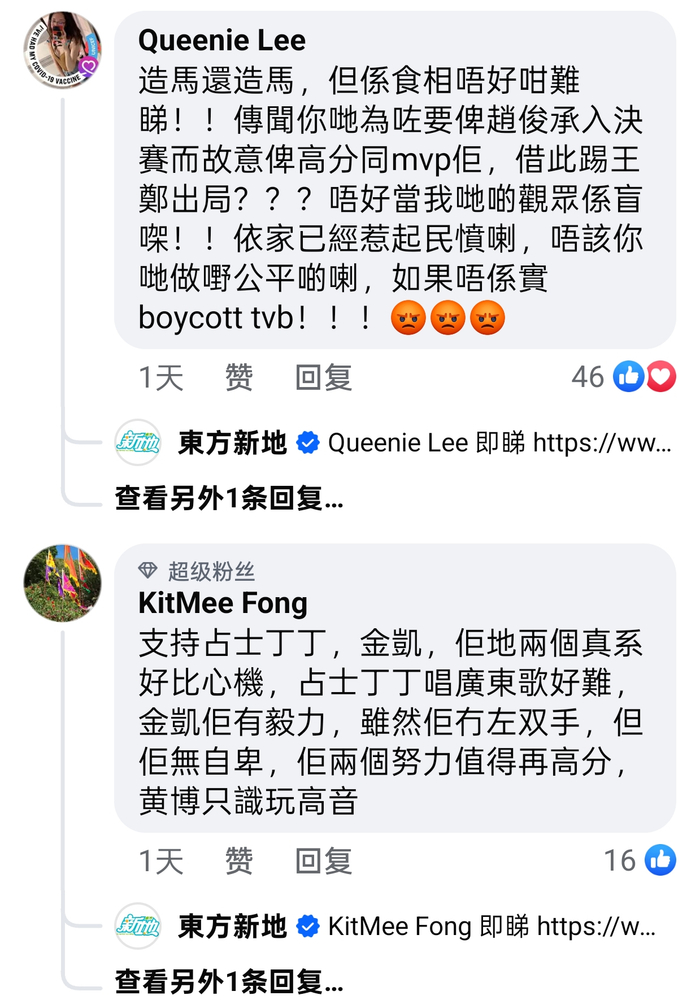 另一位粉丝则表示:“我收到消息,本来是王郑浚仁进入总决赛,但大台(TVB)为了保送赵浚承进入决赛,就算他实力不够,也要通过黑幕的方式把他强行送上去!为了淘汰王郑浚仁,节目组甚至在最后一集强行将MVP颁给赵浚承!”