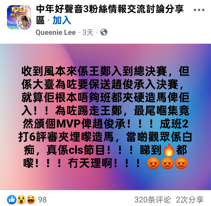 有着1.5万成员的《中年好声音3》Facebook粉丝群组中,一位粉丝发帖称:“本人收到可靠消息,5月11日启德体育园体艺馆比赛的冠军是赵浚承,亚军是黄博,季军是李金凯,殿军是张与辰!”