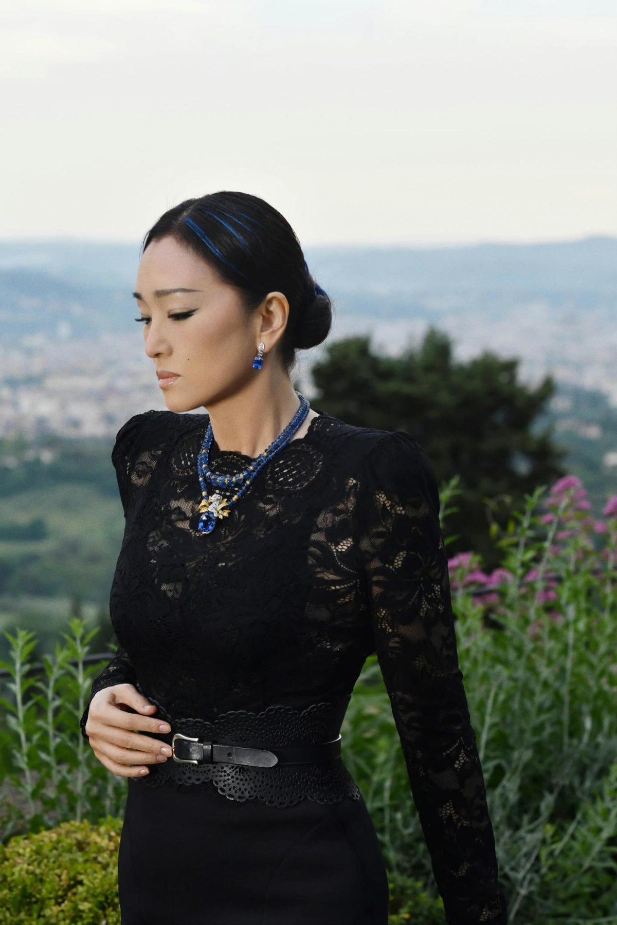 她颈部叠戴的蓝金宝石项链更是整套造型的灵魂,浓郁的宝蓝色和黑色蕾丝形成强烈对比,瞬间拉高了整体的精致度,搭配小巧的蓝宝石耳饰,和项链形成呼应,手里的黑色手拿包低调却高级,和整体风格完美适配。
