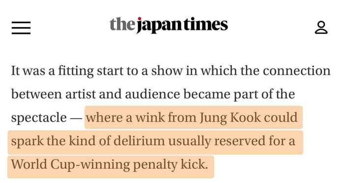《日本时报》在报道BTS东京演唱会时,着重提及了观众对柾国的热烈反响,并写道: