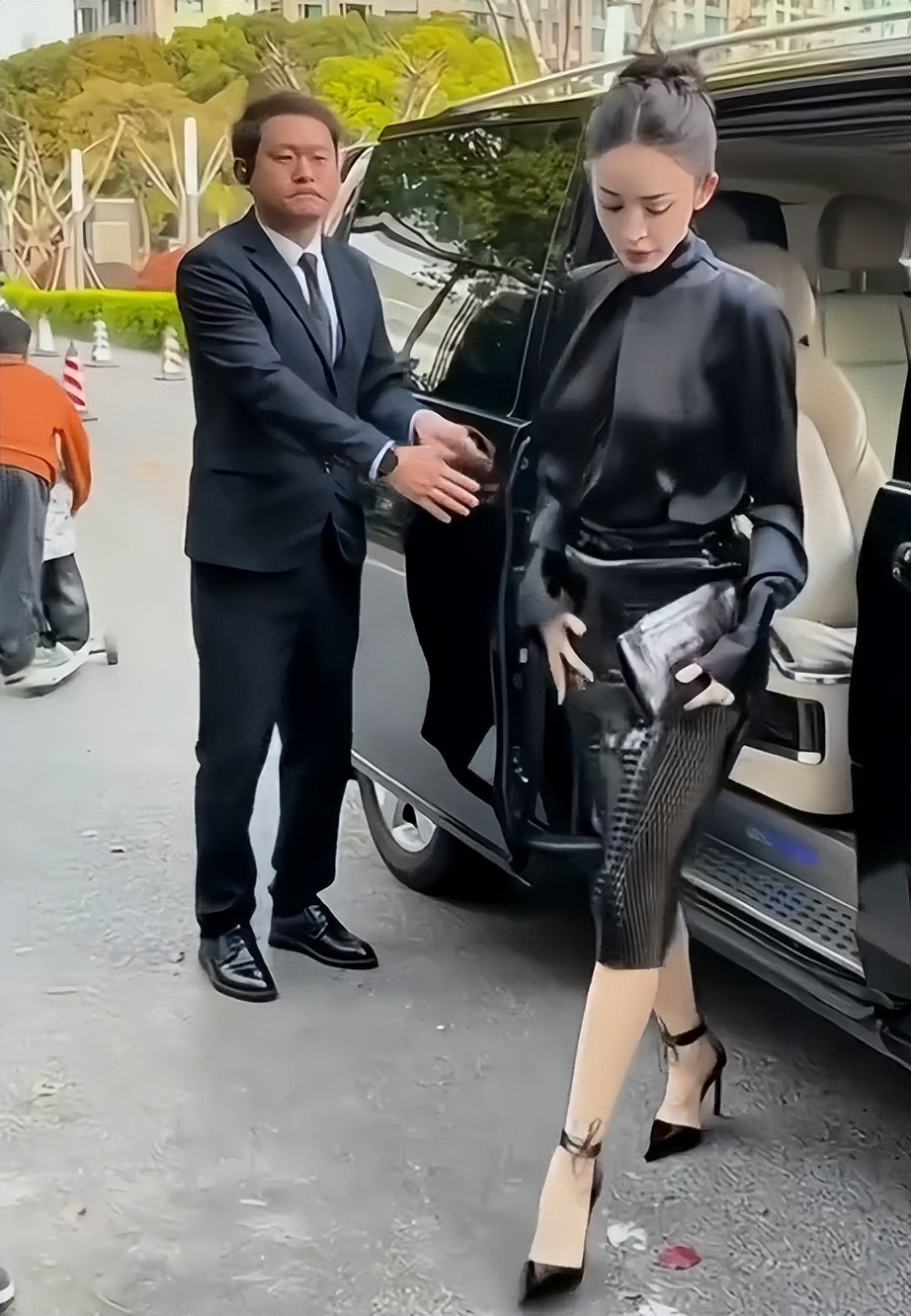 偶遇的时候,娜扎刚从车上下来,穿着一身纯黑修身西装,严严实实全裹着,却一点都不显得沉闷。