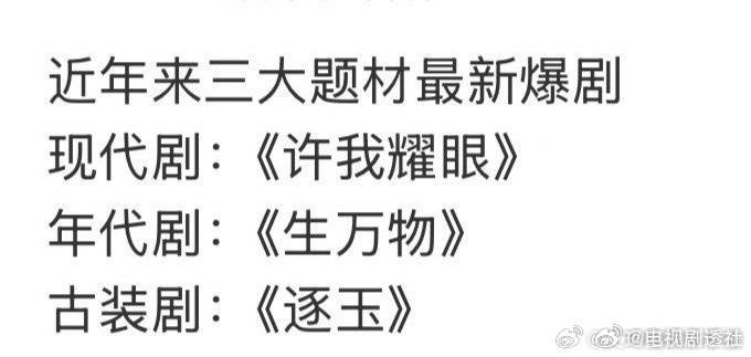 这两年,三大题材爆剧《许我耀眼》《生万物》《逐玉》依次热播,瞬间占据了观众的热门话题榜单,堪称是影视圈的一波“狂欢派对”,无论是现代剧、年代剧还是古装剧,这三部作品各自以独特的题材和精彩的剧情,给观众带来了全方位的视听盛宴,现不吝啬与大家分享这三部“爆款”剧的吃瓜感受。,让我们来看看这波三部曲的“颜值组合”——《许我耀眼》这部现代剧,主演赵露思和陈伟霆的搭档,简直是“天作之合”!两人从头到尾的化学反应,真是让人忍不住为他们的每一个互动花絮打call,剧中讲述了一个励志故事,主角从一个普通人一步步实现人生逆袭的过程,虽然剧情稍显俗套,但配乐和服装设计都非常用心,画面一帧一帧地美到崩溃,赵露思的表演力满分,陈伟霆的温柔又带着一丝冷酷,让人忍不住为他疯掉一段。,接下来是《生万物》,这部年代剧主演杨幂和欧豪,堪称是“老一辈演员的精彩对决”,这部剧以一个普通人一步步成长为医生的故事为背景,情感线条繁复却真实感人,杨幂的表演深情而稳重,欧豪则用他一贯的“老实萌”来完成角色塑造,两人配合得天作之合,剧中虽然有不少情感戏和转折,但整体节奏感强,观众不会觉得无聊,尤其是后期的医生成长之路,充满了情感张力,是这部剧的亮点所在。,最后一部是《逐玉》,这部古装剧主演张凌赫和田曦薇,简直是“国民女主”和“国民男主”的完美结合!剧中讲述了一个关于玉佩秘密的故事,张凌赫饰演的神秘男子一路追随玉佩,场面宏大而紧凑,剧情编排得很讲究,田曦薇的表演细腻,张凌赫则用他一贯的高冷和深情来塑造角色,两人配合得天作之合,虽然剧情有时会显得有些僵硬,但整体来看,这是一部值得一看的古装大剧。,这三部剧各有千秋,无论是现代剧的励志故事,年代剧的情感深度,还是古装剧的悬疑与热血,都给观众带来了丰富的视听体验,如果你喜欢感人至深的故事,《生万物》绝对不会让你失望;如果你更倾向于豪华的画面和紧凑的剧情,《逐玉》则是你的不二之选,而对于喜欢现代生活题材的观众,《许我耀眼》也绝对值得一看,这三部剧无疑是近年来最值得一看的三部剧之一,快来加入“影视狂欢派对”,一起感受这波爆款剧的魅力吧!最近几年,国产剧市场如同一锅沸腾的泡菜,各种题材剧如雨后春笋般涌现,引人捧腹不已,说到这两年的“三大题材爆剧”,我只能用一句话来形容:这三部剧,堪称是国民生活剧的“三股劲儿”,各有各的风味,堪称是观众们的“精神粮”!,首先来看这部现代剧《许我耀眼》,简直是年轻人心中的“职场圣经”,赵露思和陈伟霆的搭档固然让人遐想,但剧中的每一个情节都像是在我们身边的职场中活灵活现,主角许我耀眼从一个普通的实习生,到后来在商场中游走如鱼的过程,完全勾勒出一幅现代职场新人成长的图景,尤其是那些职场中的小插曲、误会和成长经历,简直让人忍不住回忆起自己的工作日。,接下来是这部年代剧《生万物》,简单来说就是一部“老友记”的大版本,杨幂和欧豪的演技再次证明了他们是国民演员的“王牌”,两人的化学反应让人如沐春风,剧中不仅有青春校园的甜蜜回忆,更有生活中的酸甜苦辣,完全勾起了我们当年的回忆,尤其是那些穿着校服、坐在教室里的温情,和那些在操场上追逐打闹的情景,简直让人怀念起那些无忧无虑的年华。,最后是一部古装剧《逐玉》,这部剧堪称是豪华大剧的“典范”,张凌赫和田曦薇的演技再次拿捏住了观众的心,豪华的场景设计和精心的剧情编排让人仿佛穿越到了江南水乡,从那里的公馆生活到后来的权力斗争,剧情跌宕起伏,让人忍不住为角色感到心疼,尤其是那些江南水乡的美景和服饰造型,简直是视觉的“享乐”。,这三部剧各有特色,各有魅力,无论是现代职场的奋斗,还是年代青春的回忆,还是古装江南的豪华,观众们都能在剧中找到属于自己的影子,这些剧不仅仅是娱乐的对象,更是我们生活的一面镜子,映照出我们内心最真实的感受,所以啊,下次你还在问“这两年的三大题材爆剧”看了哪部,不妨一口气把这三部剧都披荆斩棘,看看这些“国民生活剧”究竟有多好看!