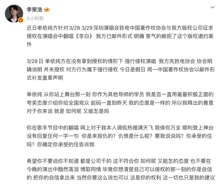 3月29日,歌手李荣浩在社交平台公开发文喊话单依纯,指其在被婉拒翻唱授权的情况下“强行侵权”演唱《李白》。