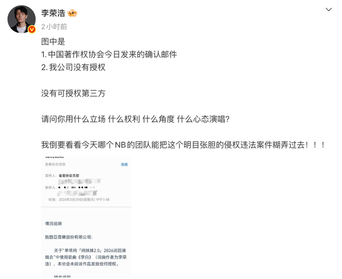 李荣浩表示,近日单依纯方针对3/28、3/29深圳演唱会致电中国著作权协会与我方版权公司征求授权在演唱会中翻唱《李白》,我方已以邮件形式明确婉拒了这个版权邀约案件,但单依纯方在没有拿到授权的情形下,仍在3月28日的深圳演唱会上强行侵权演唱。